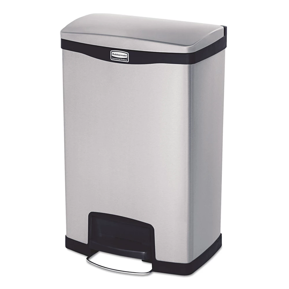 - Designed to satisfy the diverse needs of any facility. Maximizes space efficiency with a small footprint and slim profile. Fits in even the tightest spaces. Fingerprint resistant stainless steel is easy to maintain for enhanced aesthetics. Internal hinge design prevents wall damage. Quiet and controlled lid-closure minimizes noise. Liner retainer band and cinch easily and securely holds can liners. Increased foot pedal clearance for easier access and operation.